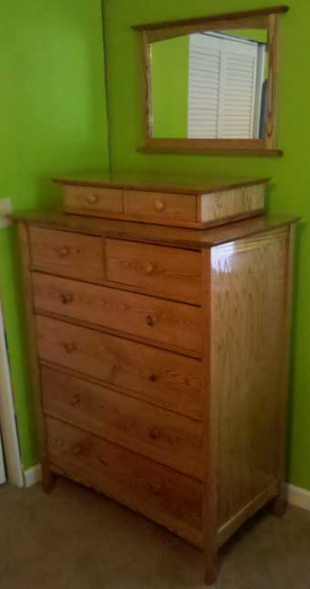 I’m 16 years old and I made this red oak dresser, dresser-top valet, and mirror with money I got for my 16th birthday. I used Minwax Golden Oak Stain and two coats of Minwax High-Build Polyurethane.