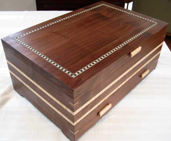 This is a fish tank stand I made for my 75 gallon tank. I used Black Walnut that has been air drying over 40 years and curly Maple.