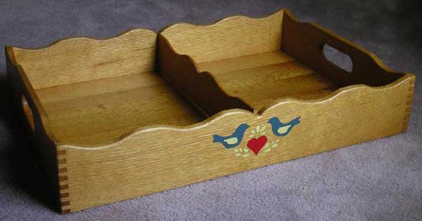 This wooden tray/carrier was a gift to my wife to carry casseroles and “fixins” to church suppers and picnics. It is constructed of 1/2″ Red Oak.