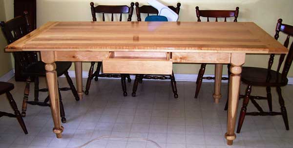 This table has solid maple turned legs and a bird’s eye maple top with bread board ends.