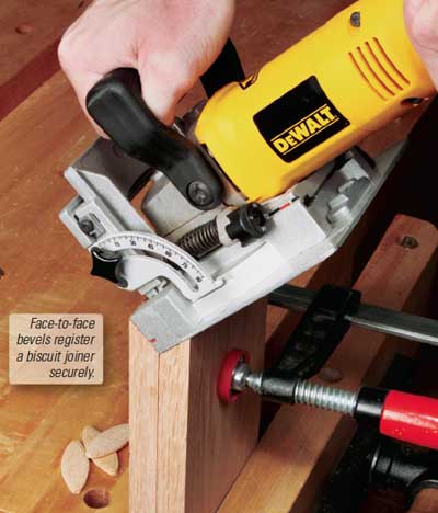 When I need to cut biscuit slots into the ends of a 45° bevel joint, I clamp the two workpieces together against their inside faces.