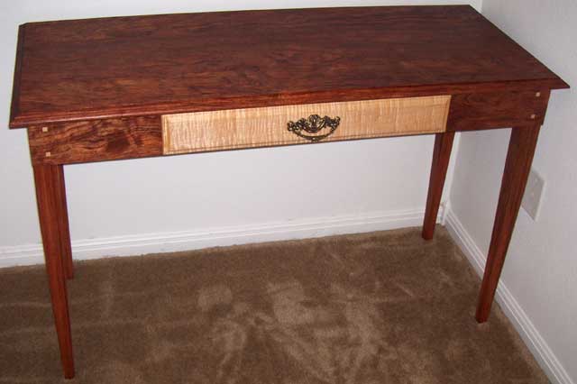 Here’s a desk that I recently made for my wife. I used Bubinga for the desk, Hard Maple for the drawer, and Quilted Maple for the drawer face.