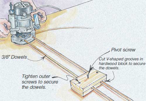 Rather than spend the money on a specialized routing attachment, I improvised and used two 36″ hardwood dowels fitted into the holes in the baseplate of my router.