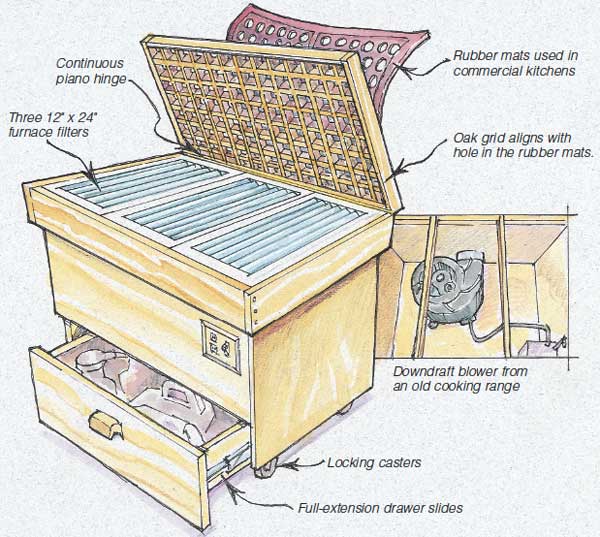 I used a downdraft blower from an old Sears cook range to help make this downdraft sanding table.
