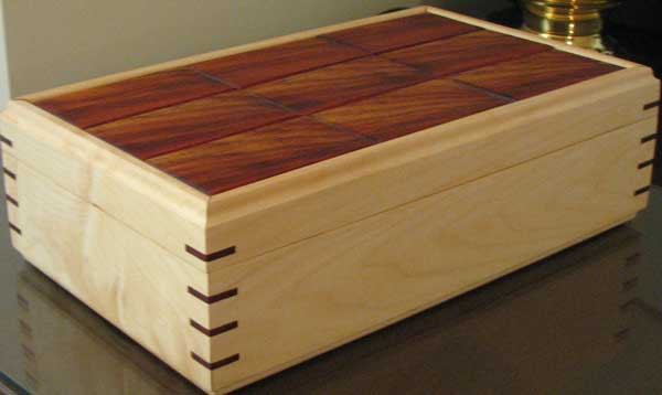 The body of the box is hard maple. The hardwood keys in the corners are padauk. The top is made from an unknown species of exotic wood.