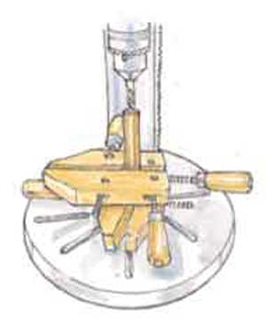 Drilling holes in the ends of dowel rods is awkward because they’re hard to clamp vertically.
