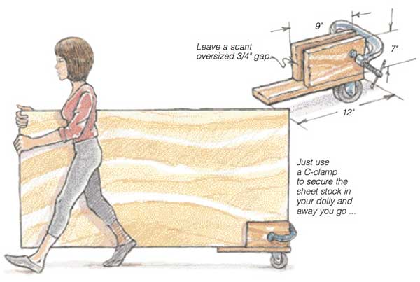 Moving heavy sheets of plywood or particleboard in and out of my shop is awkward – especially when working alone.