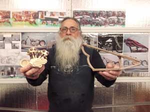 As you click through the pages of the eZine this time out, you may notice a theme of sorts. Wooden bicycles and carved motorcycles — transportation hits the woodshop. For me, transportation in the shop has a more plebeian orientation: I put everything I can in my shop on wheels. Casters are the gift that keeps on giving, in my opinion. My benchtop planer? On casters. My chop saw? On a cart — with casters. Table saw, band saw, lathe, bigger band saw, planer/jointer combo tool — all on casters.