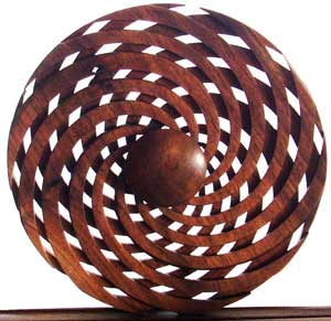 This is my turning, entitled: “Escargots go acourtin.'” Walnut 10 inches in diameter. A difficult project of reversing volutes.
