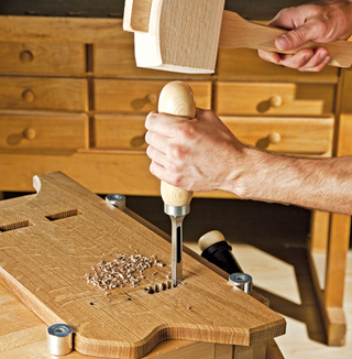 Rockler has an inexpensive new solution for making and cleaning mortises – slide a hollow mortising bit into this Mortise Chisel Handle and pound away on it with a mallet.