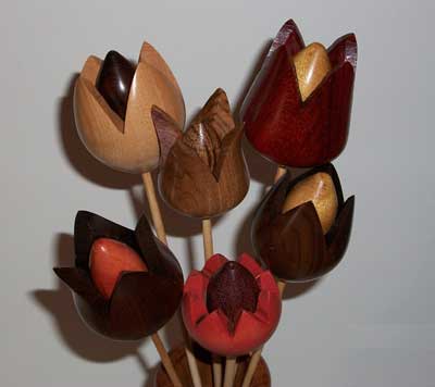 I turned the flowers out of different exotic and domestic hardwoods. Then turned the interior Bulbs from other different hardwoods.