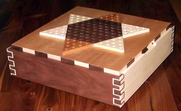 I was given complete creative design on this chinese checkers. It was also my first attempt at a double-double box joint and also veneering. I used walnut, maple, cherry, and oak