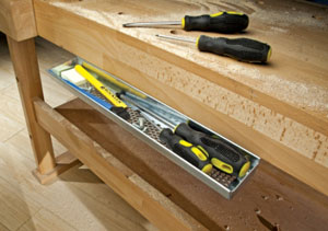 Rockler’s new Undermount Utility Tray is a 16″ long tray made of galvanized steel that attaches to the underside of a work surface, keeping tools ready but without sacrificing work space.