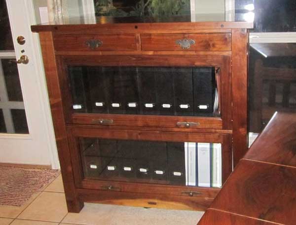 Barrister bookcase built from solid black walnut. Beveled glass doors and dovetailed drawers.