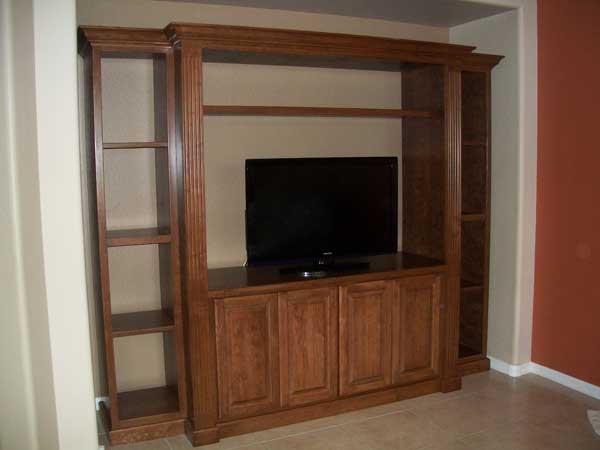 Cherry Entertainment Center built for a neighbor. Center cabinet includes fluted columns and space for 60″ TV, lower section includes pull out drawers for CD/DVD and component area.