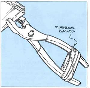 A pair of ordinary pliers can be converted into a light-duty clamp by adding a rubber band to the handles.