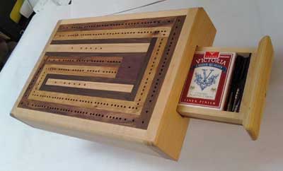 Cribbage board is made from recycled and or left over pieces from other projects. Core is made from 2 pieces of 3/4″ spruce plywood 7-1/2″ x 12″.