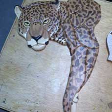 Here is my Jaguar project in Intarsia. 725 pieces. Red Oak, Wenge,Eastern Red Cedar, Satinwood, Aspen, Black Limba, Walnut.