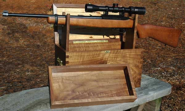 This rifle/shotgun cleaning box is made to hold a variety of rifles and shotguns while they are being cleaned. This particular box is made of highly figured Walnut for the case, supports, and removable tote.