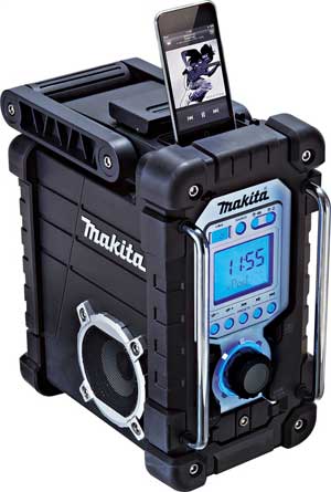 Makita’s 18V LXT® Lithium-Ion Jobsite Radio is compatible with iPhone® and iPod® MP3s through two auxiliary ports and delivers stereo sound through two 3″ side-firing speakers.
