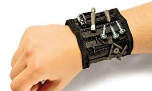 The HandyBand is a magnetic wristband, adjustable to fit wrists of any size, that can hold nuts, bolts, screws, nails or even small tools like wrenches and screwdrivers.