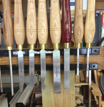 This handy rack will keep your lathe tools stored super handy but out of the way. Use two or, if you have several tools, use four of the 18″ magnetic bars.