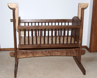 I just completed a cradle for our first grandchild based on a design that my son had seen and liked. It is made of walnut, maple and ash.