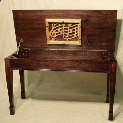 This is an older styling Piano Bench made from hard maple with spade legs. The legs have Myrtle inlay.