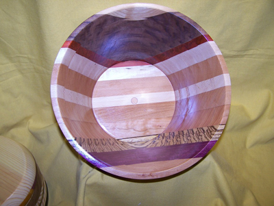 Here is a bowl I made using cherry, zebrawood, purpleheart, redheart and maple. The bowl is 6″ high and 11″ in diameter.