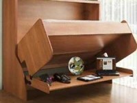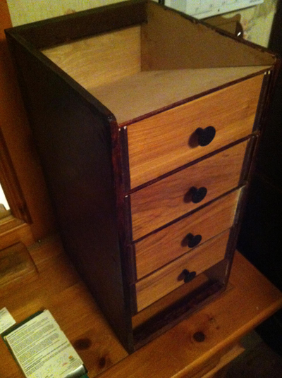 This desktop unit with sloping drawers is for organizing and storing individual canceled check images. I made it of birch plywood, cherry, and pine.