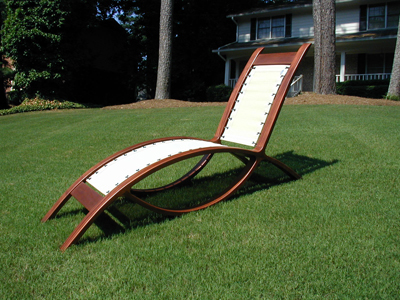 This is a prototype of a custom designed chaise lounge. The frames are made of laminated mahogany. The seating surface is open-weave webbed material with grommets along the edges, through which is laced to the side rails.