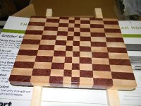 This is a designer cutting board. It is a small one, 9 X 12″. The wood is maple and purpleheart.