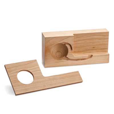 Rockler Woodworking and Hardware’s Koostik Kit is a wooden cradle amplifier for all iPhone models.