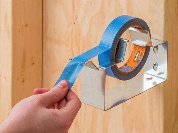 Metal dispenser keeps masking tape at the ready.
