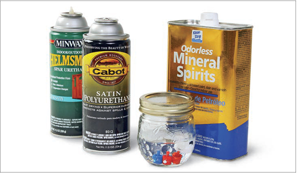 Instead of turning my cans of spray finish and paint upside down and spraying the gas to clear the nozzle, I pull off the nozzles and drop them into a jar of mineral spirits and give it a few shakes.