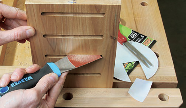 Here’s a quick tool for sanding inside corners and other unreachable areas: apply a piece of sticky-backed (PSA) sandpaper to the blade of a putty knife.