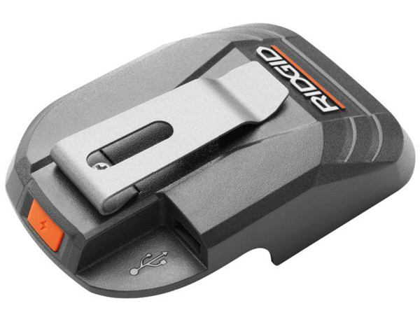 Charge a smartphone or tablet by clipping this accessory onto a RIDGID 18-volt battery and using its 2.0 amp USB port.