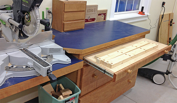 This reader offers a helpful tip about how to keep project parts close at hand but not in the way when you’re working at a home-built miter saw station.