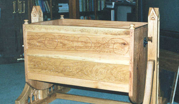 This white oak cradle is based on a replica of a 14th century English cradle from the collection of the Medieval Merchant’s House in Southampton, England.