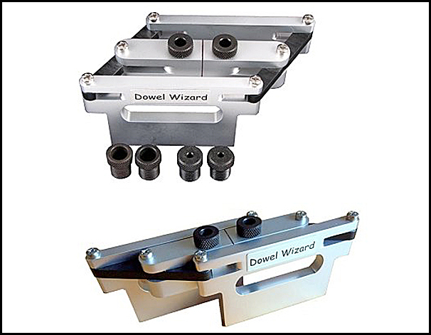 Clamp-on adjustable jig fits a range of workpiece thicknesses and centers pairs of dowel holes in three diameters automatically.