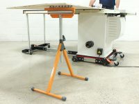 Pedestal support stands offer two different head designs and vertical adjustment to suit table saws and other shop machinery.