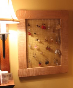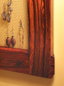 I’ll start with me. About a month ago I posted that my wife wanted something to hang her earrings on. She suggested that a frame of some sort with screen inside would be just the ticket. She could hang it on the wall and see all of her earrings more easily instead of digging through her jewelry box to find them. Seemed like a pretty clear request to me, and a fun little project to make. So, I built two frames of the same size and style for either side of her vanity mirror. But, I made one from tiger maple and the other from some particularly figured cocobolo I was saving for a special purpose. The corners are half laps. The ends of the joints extend a little beyond the frames, and I shaped them into elongated pyramids. I found some brass screening online and experimented with West System epoxy to secure it into shallow rabbets.