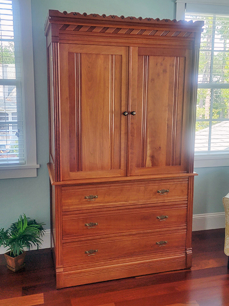 “Growing up in the 1950s, my grandad owned a corner grocery store, and there were always small wooden crates in the basement. Occasionally, I’d ask if I could take one to make something (bookends, bird houses, etc.). Fast forward to 1969. My wife and I married while I was still in college. Like you, money was really tight. Our first apartment was furnished in family attic cast offs that we repaired, stripped and refinished (a small mahogany drop leaf, a grandmother’s antique bed, another grandmother’s cedar hope chest, a card table and chairs). One of our first purchases was a turntable, amp and speakers. These sat on the floor of our empty living room for almost a year, when my wife wondered whether I could build a record cabinet to house them and our albums. Her grandfather gave me a few reclaimed pine boards that I cut to size with a hand saw. I bought a Stanley No. 4 smoothing plane that I used to joint the boards to glue up the sides, shelves and top of the cabinet. I also used the plane to raise the panels for two raised panel doors on the piece. I designed a base molding, and a talented older friend showed me how to cut the coves in the molding on his table saw. As we worked, I said it would be cool if someone made furniture kits with the pieces of wood already milled and cut to size for guys like me who had the will but not the tools to build furniture. The record cabinet came out better than I expected. That started my love affair with sawdust. A couple years after this first successful project, I saw an ad for a grandfather clock kit from the Emperor Clock company. It had all of the lumber and parts milled and pretty much ready to trim or miter and glue/screw together. I built two of these (which are still in the family). I learned a LOT repairing and refinishing antique pieces, observing how they were designed and constructed. That experience has colored everything that I’ve built. Fifty-plus years on, I’ve acquired a collection of tools that make wood working much easier and have built about 100 different tables, cabinets, built-ins, chests, sideboards and small projects for members of the family. My proudest achievements include a reproduction cherry armoire to match an antique Eastlake bedroom set (bed, dresser, and commode) that we have, a slate bed oak pool table and a black walnut bourbon storage/service piece called a Cellarette. I could never make a living as a cabinet maker (it’s a hobby and stress relief), but I love every minute I get to spend in my shop.” – Mike Campanella