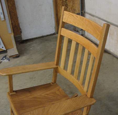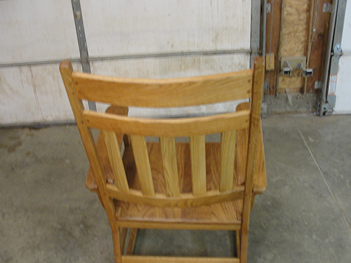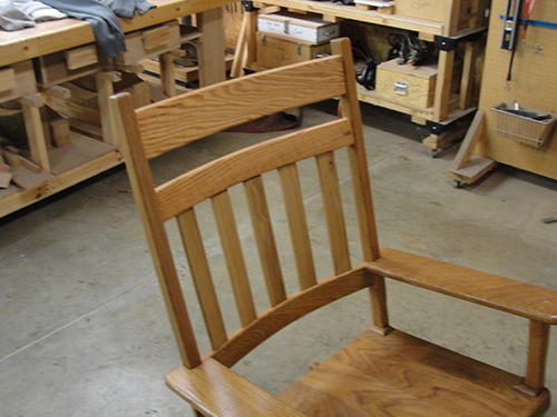 I built this chair for donation to a local church’s spring festival. The material is white oak. It was the first time using this material, and I learned a great deal. I used bent form lamination to form the back and the rockers. I also built and used a horizontal router to form the mortises, and used floating tenons to connect them. I got rave reviews from my wife.