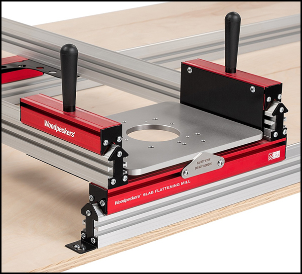 The Woodpeckers Slab Flattening Mill, along with your router, lets you accurately and safely flatten oddly shaped and oversized slabs in a home shop. Using the Mill is as easy as sliding your router across the slab in repetitive passes, moving over a little less than the width of your router bit until the slab is flattened. After flattening, slabs should only need a light final sanding.