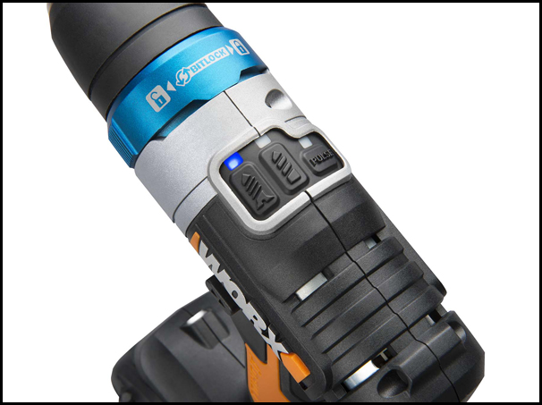 The WORX Ai Drill is designed to be easy for first-time users and DIYers: the “Ai” stands for “advanced intelligence,” and the drill makes some decisions for you. Its three drive modes are called drill (for hole drilling), and SafeDrive and PulseAssist (for driving screws). They’re activated by touch-sensitive keypads on the top of the drill. The Ai Drill has no clutch settings: it uses the SafeDrive mode to deliver the correct amount of torque and then backs off once the screw is flush with the surface. PulseAssist applies enough bit rotation to drive the screw snug to the surface without overtightening or stripping the screw head; it works in reverse to back out screws, again without damaging the screw head. The drill moves at a slow, optimal speed to avoid stripping screws. Another feature is “Bitlock™”: when you load a drill or driver bit into the tool’s 3/8-in. chuck, the motorized jaws tighten and self-center the bit, with 30 percent more torque than hand tightening. The jaws run in reverse to release bits.